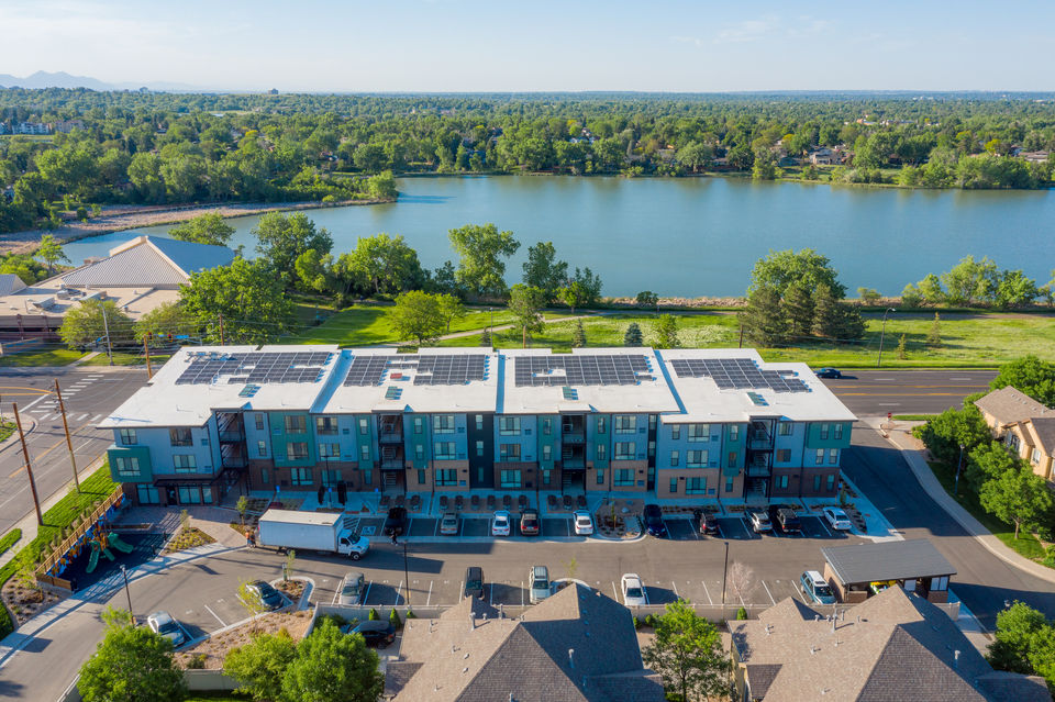 The aesthetic of this building fits well within the neighborhood with timeless materials like brick, wood-look cementitious siding, and metal panels. The north facade runs parallel to Jewell Avenue and provides sweeping views of Kendrick Lake Park across the street and the north-west front range mountains and north-east towards the Denver skyline. The north-facing level 1 units offer front porches with access directly outside providing a quick walk to Kendrick Lake Park. The units are designed to be bright, open, and efficiently laid out. With a higher concentration of 2-bedroom and 3-bedroom units, this project offers large kitchens that open directly to the dining and living rooms with large windows. The project provides ground-floor accessible units meeting FHA requirements.